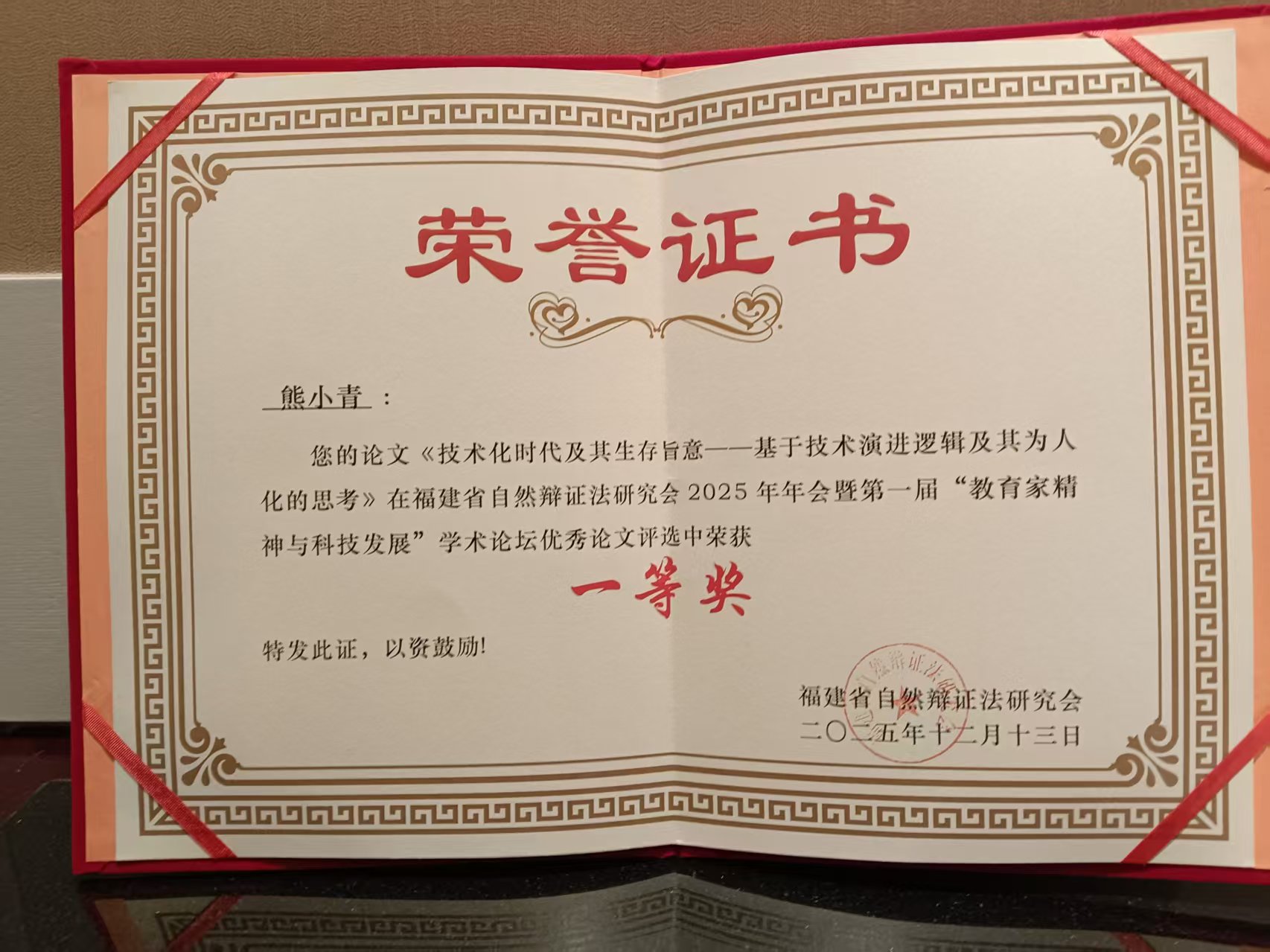 近日,福建省自然辩证法研究会2025年年会暨第一届“教育家精神与科技发展”学术论坛优秀论文评选结果公布。永利3044noc熊小青教授的学术论文《技术化时代及其生存旨意——基于技术演进逻辑及其为人化的思考》在评选中脱颖而出,荣获一等奖。